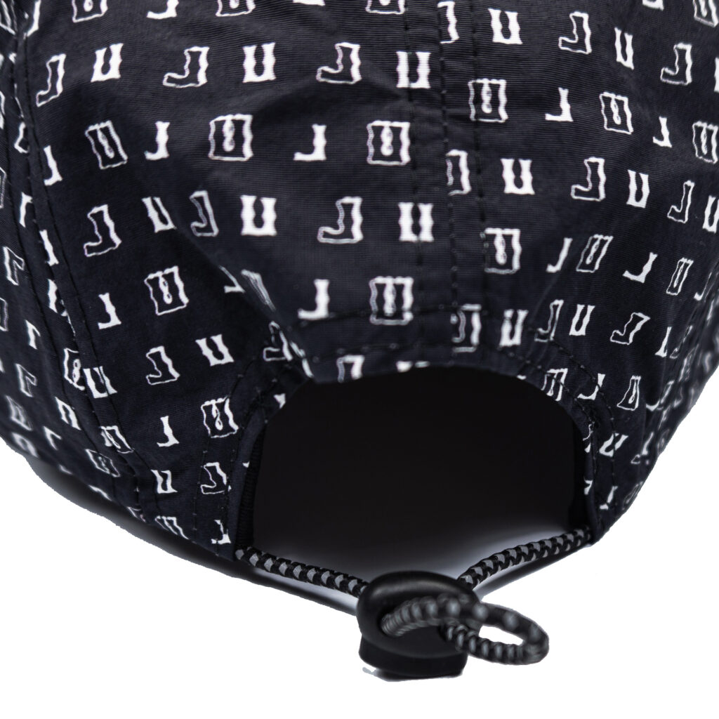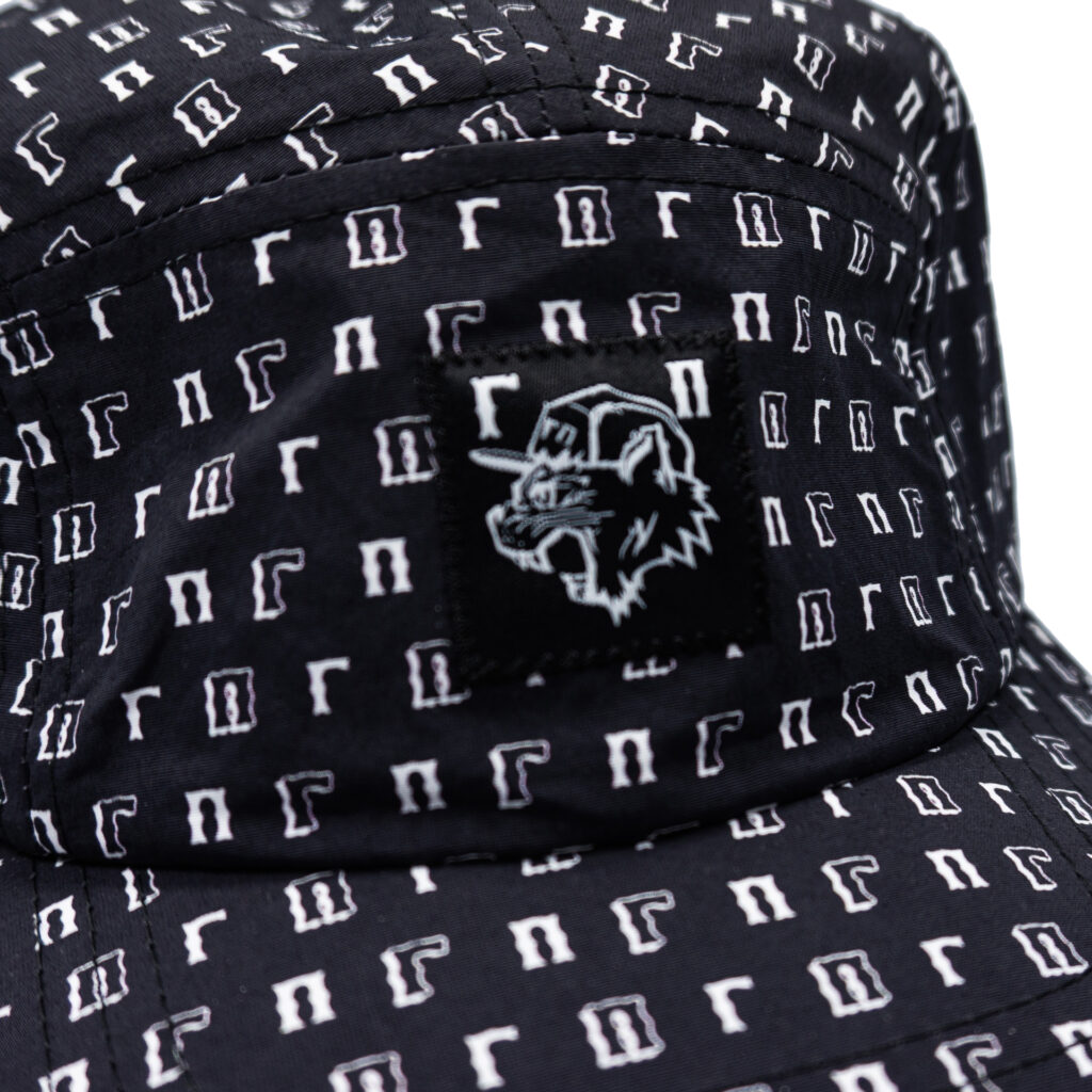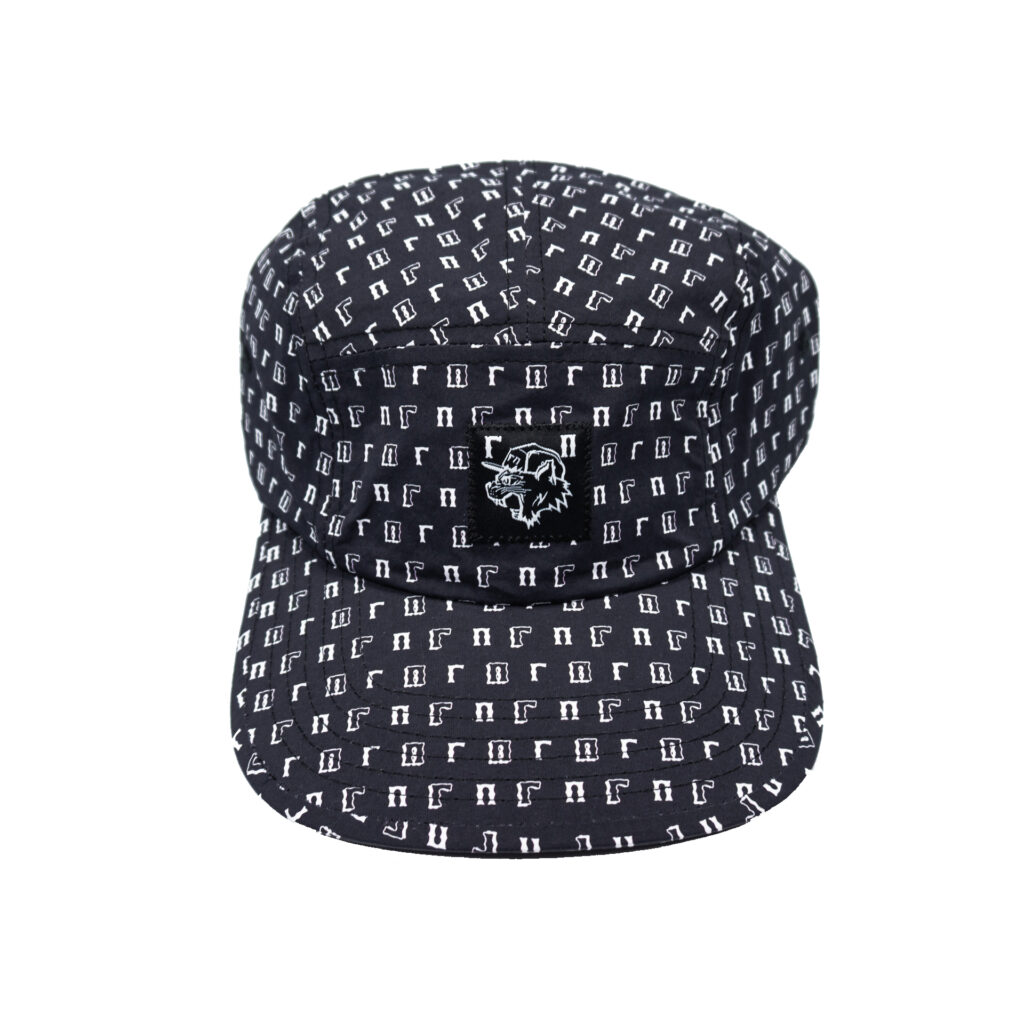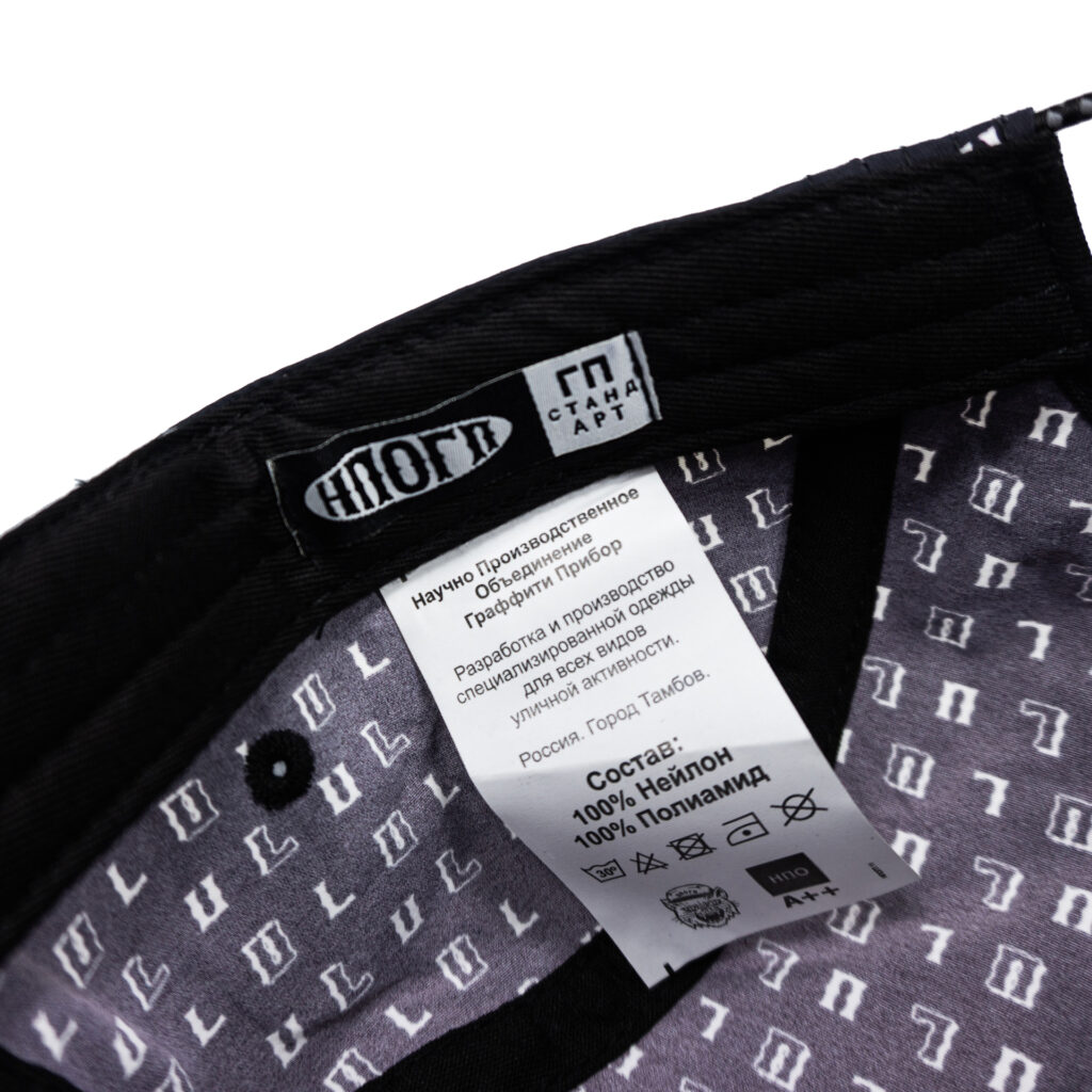 Черная пятипанельная кепка с логотипом «ГП». Средняя посадка, прямой козырек, ремень фиксации на затылке.